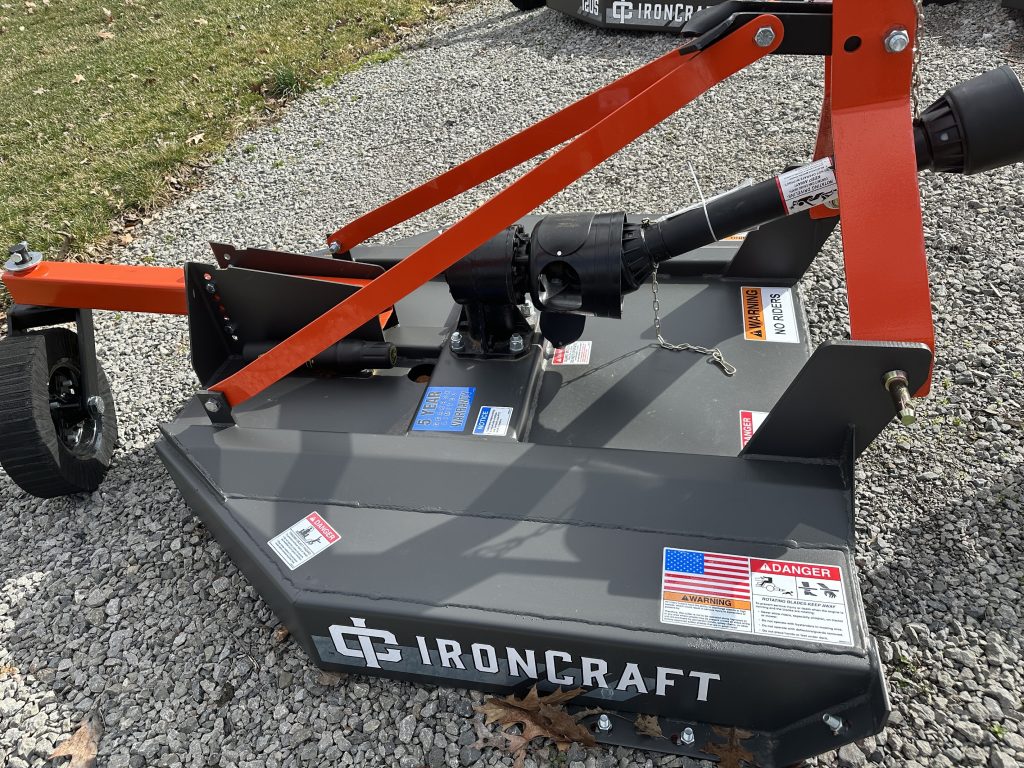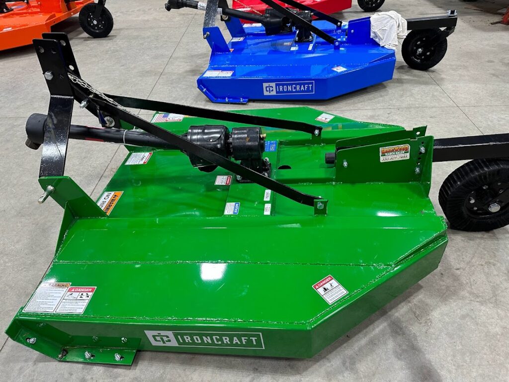 IronCraft Brush Hog 60" 3pt cat 1 flex hitch. 540 PTO drive. 55hp gear box. Stump jumper pan. 5 year manufacture gear box warranty applies. Weighs 596 lbs. 11 gauge steel construction. Many colors options in stock. Made in the U.S.A.