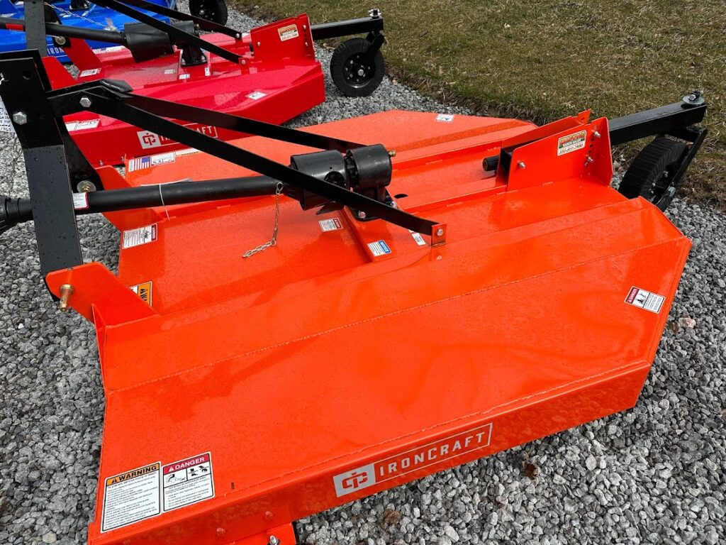IronCraft Brush Hog 72" 3pt cat 1 flex hitch. 540 PTO drive. 55hp gear box. Stump jumper pan. 5 year manufacture gear box warranty applies. Weighs 726 lbs. 11 gauge steel construction. Many colors options in stock. Made in the U.S.A.