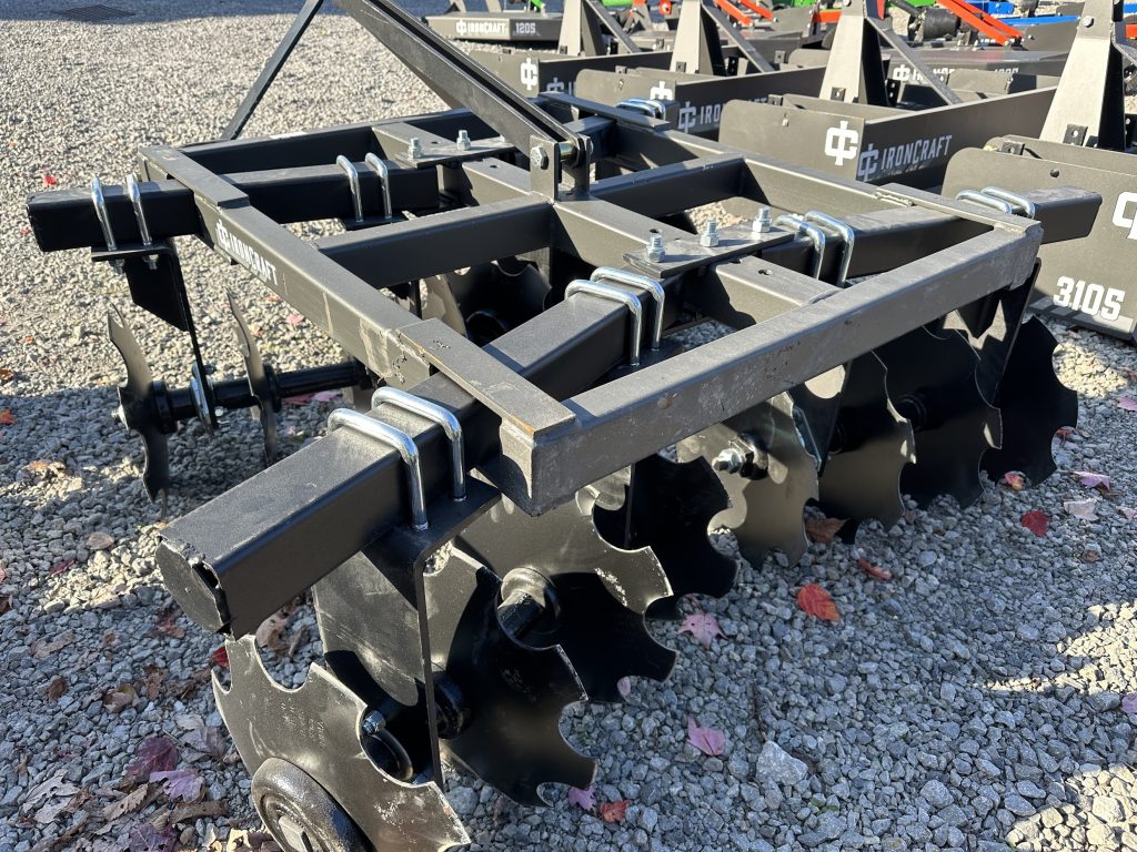 IronCraft tube frame disc harrow. 5' & 6'. 7300 series. Medium duty usage. Notched discs. Unit has sealed bearings. Cat 1. HP 30-45. 5' 650 lbs. 6' 700 lbs. 5' $2390 6' $2615.