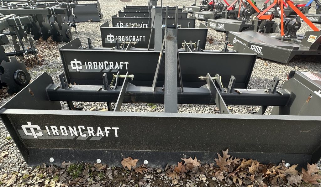 Ironcraft 5' box blade. HP 15-45. 60" working width. 323 lbs. 6" cutting edge. Category 1. 4 shanks. Standard duty. 1 year manufacture warranty.